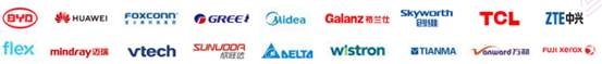 富士康、迈瑞医疗、万代玩具、益达服装、中兴通讯、格兰仕、京瓷、创维、万家乐、美的、比亚迪、华为、一汽-大众、安吉尔、比亚迪锂电池、创维、美的厨热、美的制冷、美的家电、顺络电子、伟易达、康佳、伟创力、理光等。