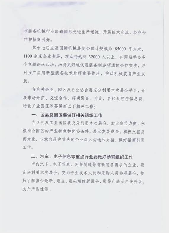 近日,重庆市经信委发布了关于做好第十七届立嘉国际机械展相关组织工作的通知,要求各有关企业、园区及行业协会等要做好相关参展、参观的组织工作,并配合做好展会的各项宣传。