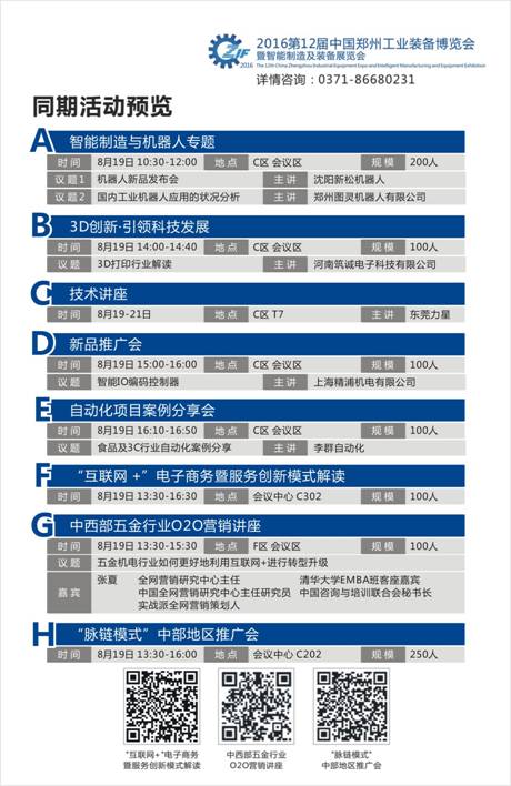 郑州工博会结合知名企业沈阳新松、郑州图灵机器人、河南筑诚电子、东莞力星、上海精浦机电及行业媒体中国工控网,在展会同期举办数十场高端论坛会议,涉及时下热潮机器人应用、3d打印、智慧工厂下食品及3C行业自动化发展变革之路、互联网+对传统工业的冲击与机遇、高精尖机床新品技术等;展会结合相得益彰,紧跟河南发展需求,旨在引导行业发展新风向,增强企业沟通交流,把握行业趋势,解决现代工厂技术改革问题,共同探索行业转型之路。