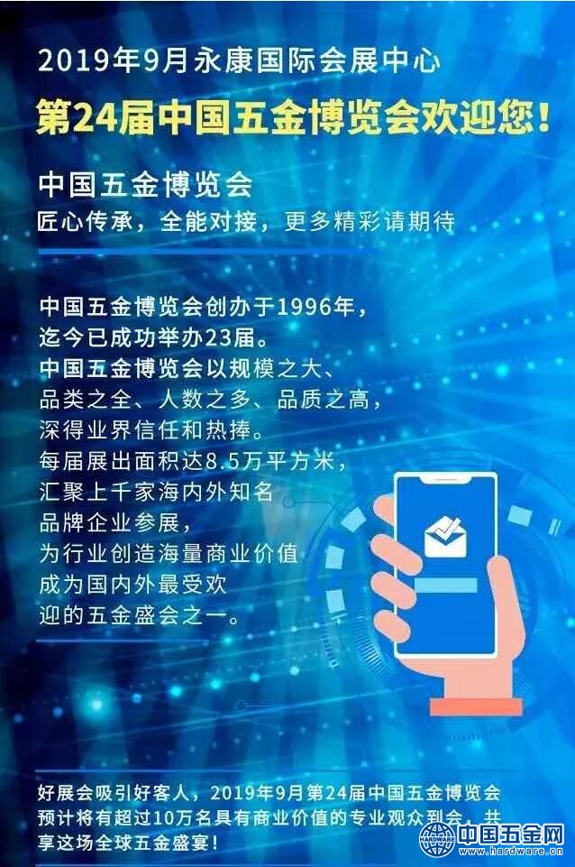 据悉,今年9月26日—9月28日,为期3天的第24届中国五金博览会将在永康国际会展中心举办。本届博览会参展范围为电动工具类、车类、健身休闲类、工具五金类、机电产品类、日用五金、五金电器类、机械设备类、其它五金类等。