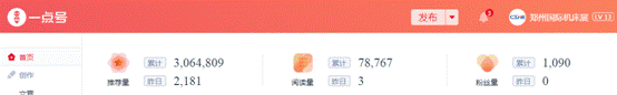 目前郑州工博会3个头条官方账号总粉丝6834人,累计总阅读近150万,以中西部制造业内容为基础,辐射全国装备制造业,我们现在就是行业内做的最好的,今后也会做得更好!努力打造国内装备制造业行业平台!