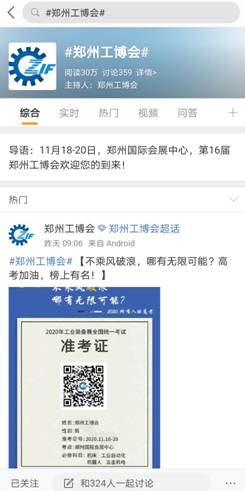 郑州工博会新浪微博主做话题运营,#郑州工博会# 话题目前总阅读量30万,文章总覆盖人群达50万,#郑州工博会# 超级话题社群也已经创建完成,将获得更大曝光量、更精准的互动交流渠道......