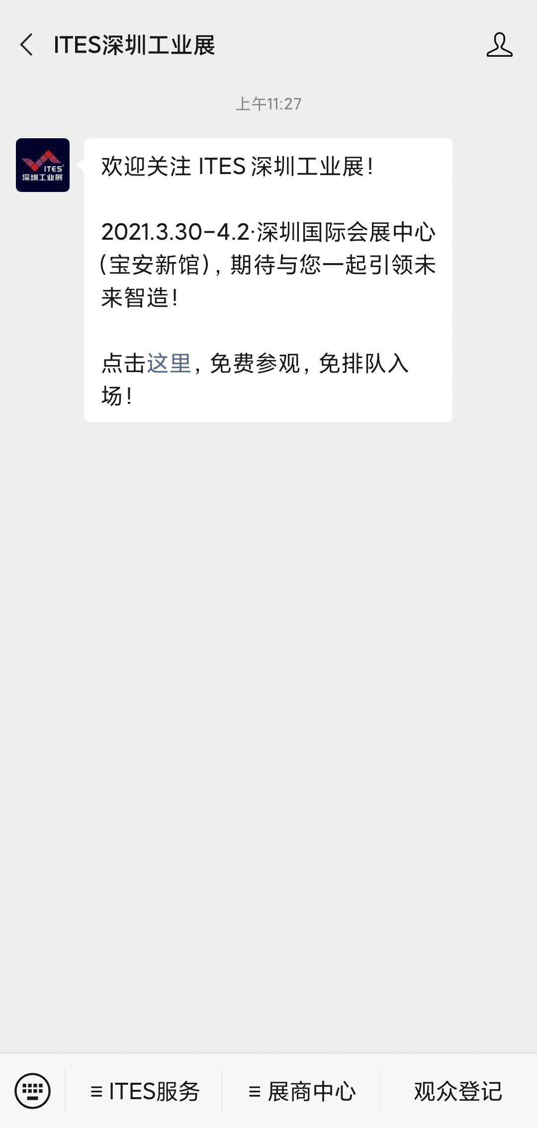 第一步:关注“ITES深圳工业展”公众号(长按识别下方二维码)