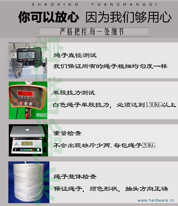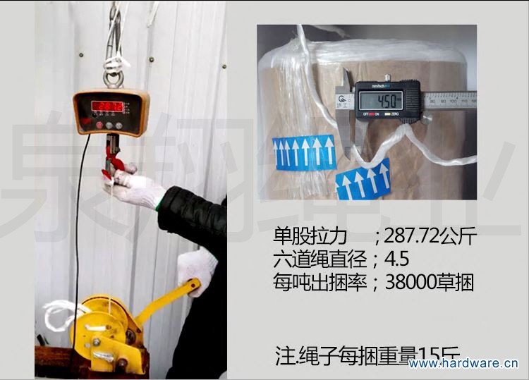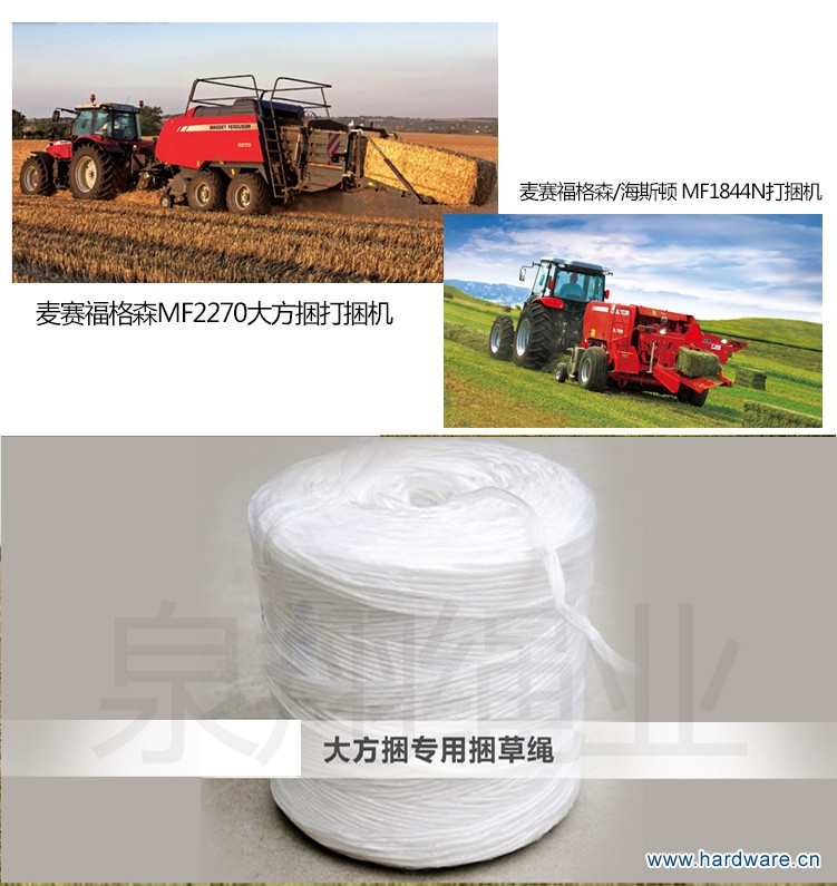 安徽省,界首市泉翔绳业有限公司是从事过年内外,自动秸秆捡拾打捆机在田间工作,打捆中,出现断绳、散捆、不打结、等这一系列问题,进行研发新产品.公司通过大量的调研和实验,根据不不同的型号打捆机,生产了不同型号的打捆绳,本公司产品直径有2.6-2.8cm,拉力150KG-300KG,可根据草捆,重量大小,加工生产