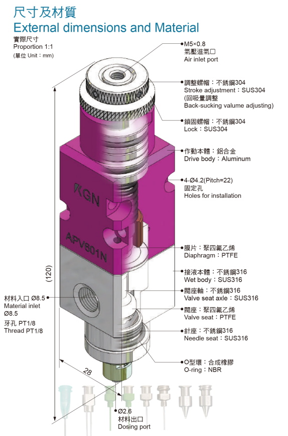 ▲APV601N主体采用铝合金材料,质轻柔软强度高,耐腐蚀;螺帽采用不锈钢304材料,耐磨耐腐;接液本体、阀座轴,针座采用更耐腐的不锈钢316材料,无惧接触各类流体,应用范围更广;内置塑胶O型环,密闭性好不漏胶。