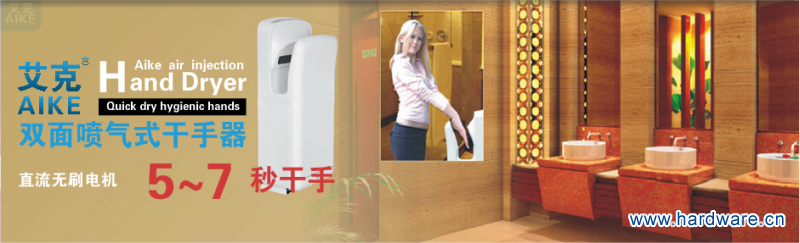 高速干手器领跑品牌—艾克电器 浙江艾克电器有限公司,是一家专业生产和经营各种双面喷气式干手器、单面高速干手器、嵌入式高速干手器、挂壁式手部卫生一体机、手消毒器、皂液器、纸巾机等卫浴电器的专业化公司。产品广泛的应用于工厂(食品、医药、电子等工厂)消毒卫生电器;公共卫生间全方位清洁电器。其中双面喷气式高速干手器从2006年开始,中国市场占有率为70%以上。产品远销欧盟、美国、澳大利亚、日本、巴西、以色列、台湾等国家和地区,并获得各项权威认证。公司工厂坐落于环境优越、交通便捷的浙江省Z具有潜力的十大经济开发园区内;公司占地16000平方米,建筑面积约25000平方米;公司固定资产合计4500万元。