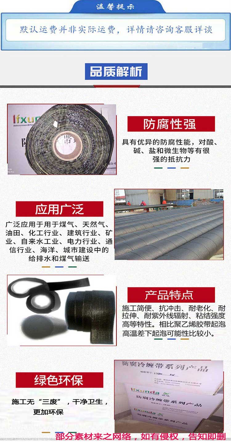 该产品基材为独特的改性聚丙烯编织纤维布,采用丁基橡胶改性沥青做防腐胶层。其基材是纤维结构可有效地抵抗由于土壤应力而产生的蠕变破坏,经老化试验检测证明其耐蚀寿命达50年以上,各项检测指标大大高于SY T0414—2007,完全达到美国ANSI AWWAC209-00和NACEMR0274-95指标。是管道冷防腐施工胶带中的Z佳选择,也是防腐Z经济的选择。(符合西气东输二线和川气东输标准的聚丙烯胶带)