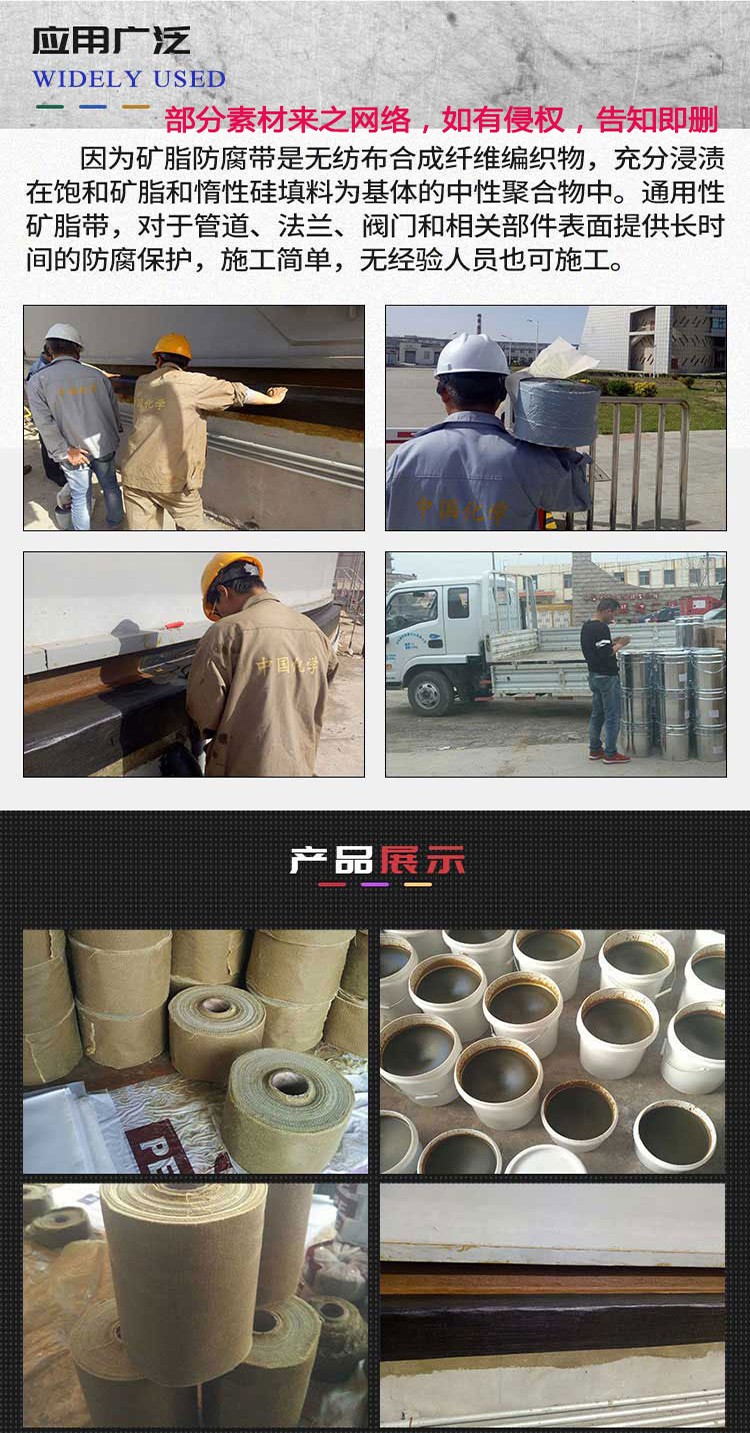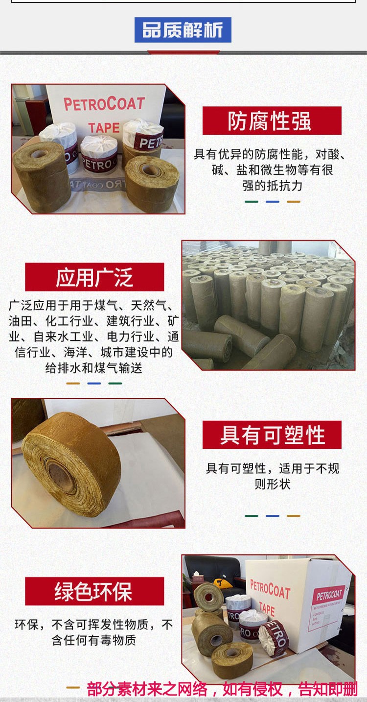 4、胶带具有优异的可塑性和柔韧性,可以被捏成任何形状,适用于任何规则和不规则形状的工件表面的防腐。