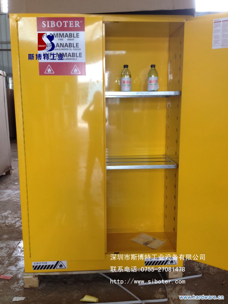 2.柜体内部配备隔层板,可以在60cm间距自由上下调节高度,有效地利用空间来存放装有各类可燃性化学品物质的安全罐;