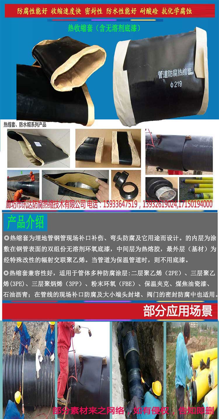 现场补口用热收缩套,其内层为涂敷在钢管表面的双组份无溶剂环氧底漆,中间层为热熔胶,基材为经特殊改性的幅射交联聚乙烯。当使用两层结构热收缩套时,则不用底漆。热缩套为埋地管钢管现场补口补伤、弯头防腐及它用途而设计的。 热收缩套是整体无缝结构的热缩套,周向收缩率≥50%。主要用于管道补口防腐、大小头、阀门密封等。热缩套热熔胶良好粘接性能可与钢管底层以及管涂层例如聚乙烯、聚炳烯、环氧粉末、环氧煤沥青等结合行成良好的密封保护的热熔胶。(预热困难时可采取低温涂刷性能优一的的底漆来获得良好的效果) ,热收缩套产品适用于各种管体防腐涂层如:二层聚乙烯(2PE)、三层聚乙烯(3PE)、三层聚炳烯(3PP)、粉末环氧(FBE)、保温夹克、煤焦油瓷漆、石油沥青。在管线的现场补口防腐及大(端头封堵)、阀门的密封防腐中获得大量应用,效果良好。这已为许多管道工程所证实。 配合优一的热熔胶及底漆, 热收缩套能适应不同的运行温度条件,抗蠕变性能好,寿命长。