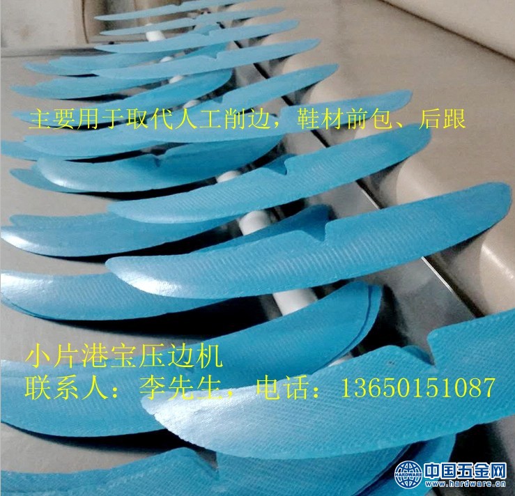 应用范围:制鞋厂小片港宝压边成型及低温热熔港宝制品生产企业,板式压边机是靠压板成型,速度相对较慢,产量相对较低,全自动滚筒式压边机取代传统人工削边,节减了繁琐工序,大大提高了生产效率,同时减少了鞋材厂对大量人工的需求。