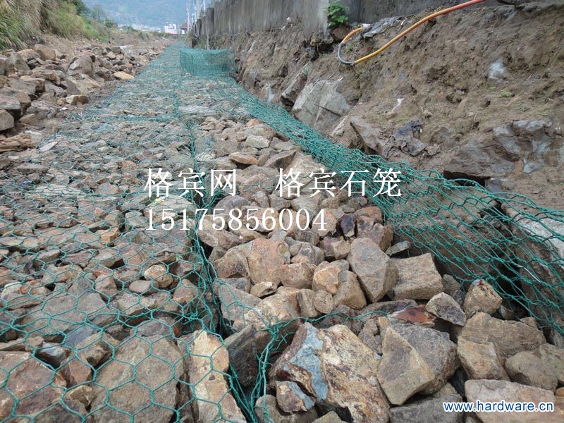 格宾笼是将抗腐、耐磨、高强的低碳高镀锌钢丝或5%~10%铝锌稀合金镀锌层钢丝包塑上一层PVC或者PE同时又称高尔凡格宾笼,其成品结构将更加具有防锈,防静电,抗老化,耐腐蚀,高抗压,高抗剪等特点,能有效抵抗海水或高度污染环境的侵蚀。由机械将双线绞合编织成多绞状、六边形网目的网片,其双线绞合部分的长度应不小于5cm,以不破坏钢丝的防护镀层。河道治理格宾笼可根据工程设计要求组装成箱笼,并装入块石等填充料后连接成一体,用做堤防、路基防护、水利建设等工程。主要用作河道、岸坡、路基边坡护坡结构。既可防止河岸遭水流、风浪侵袭而破坏,又实现了水体与坡下土体间的自然对流交换功能,达到生态平衡。坡上植绿可增添景观、绿化效果。