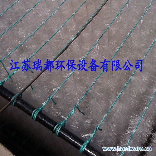 填料筛选了聚烯烃类和聚酰胺中的几种耐腐、耐温、耐老化的优质品种,混合以亲水、吸附、抗热氧等助剂,采用特殊的拉丝,丝条制毛工艺,将丝条穿插固着在耐腐、高强度的中心绳上,由于选材和工艺配方精良,刚柔适度,使丝条呈立体均匀排列辐射状态,制成了悬挂式立体弹性填料的单体,填料在有效区域内能立体全方位均匀舒展满布,使气、水、生物膜得到充分混渗接触交换,生物膜不仅能均匀地着床在每一根丝条上,保持良好的活性和空隙可变性,而且能在运行过程中获得愈来愈大的比表面积,又能进行良好的新陈代谢,这一特征与现象是国内目前其他填料不可比拟的。