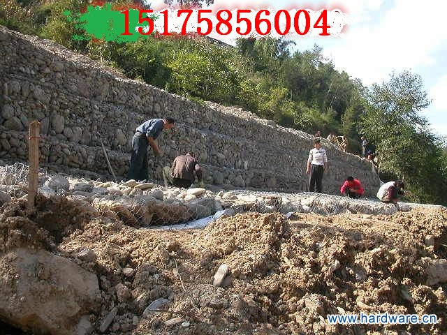 产品加工流程:选取ASTM/EN标准低碳钢丝→高上锌表面处理→PVC/PE/矽胶覆塑→调整机器→上丝→机器编织→人工剪切,组装→抽样检验→折叠打包→运输,运输至工地后的网笼为半成品,施工起来极为方便只需将网笼抻开将石块填充到箱内即可,以块石填充好的防护体不仅稳固性和防冲刷性能极强而且具有很好的生态绿化作用。
