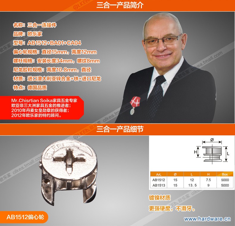 【欧乐家】板式家具连接件 三合一连接件