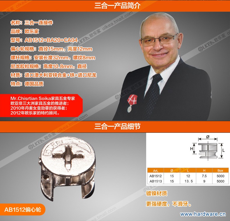 【欧乐家】板式家具连接件 三合一连接件
