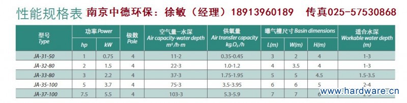 注:表中进气量及增氧能力是在标准试验条件下(20°C水温,气压101.325kPa),曝气机潜水深度3m,试验介质为清水。在中度污水中,增气能力可按系数0.85作为设计依据。