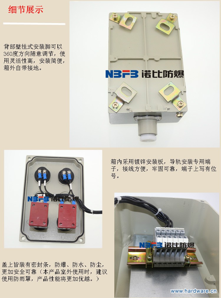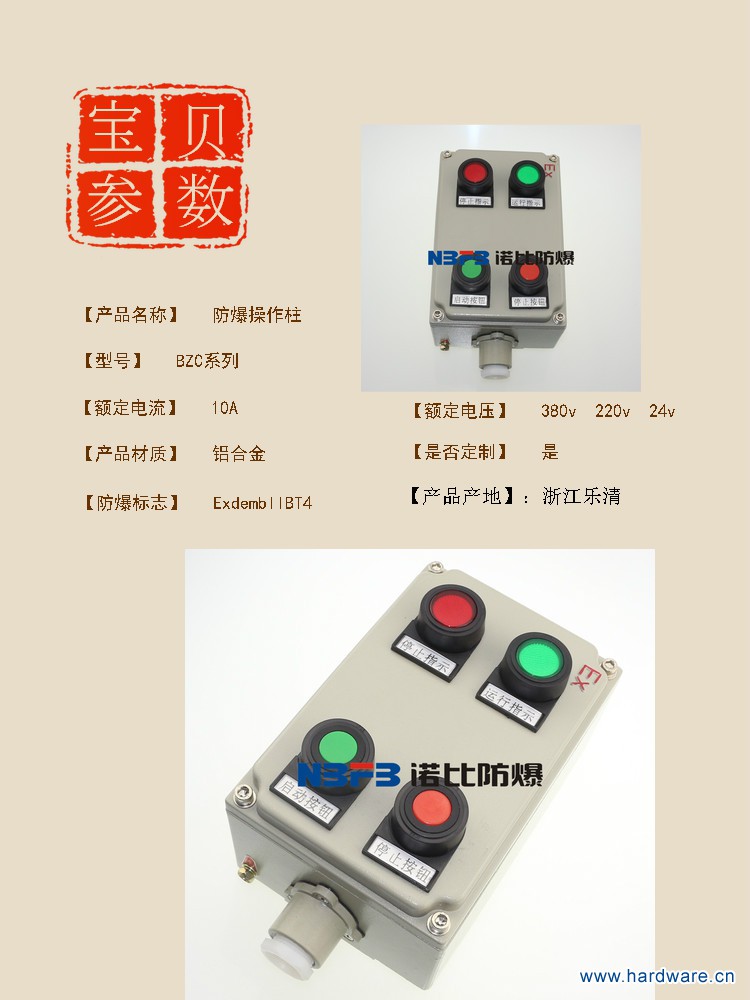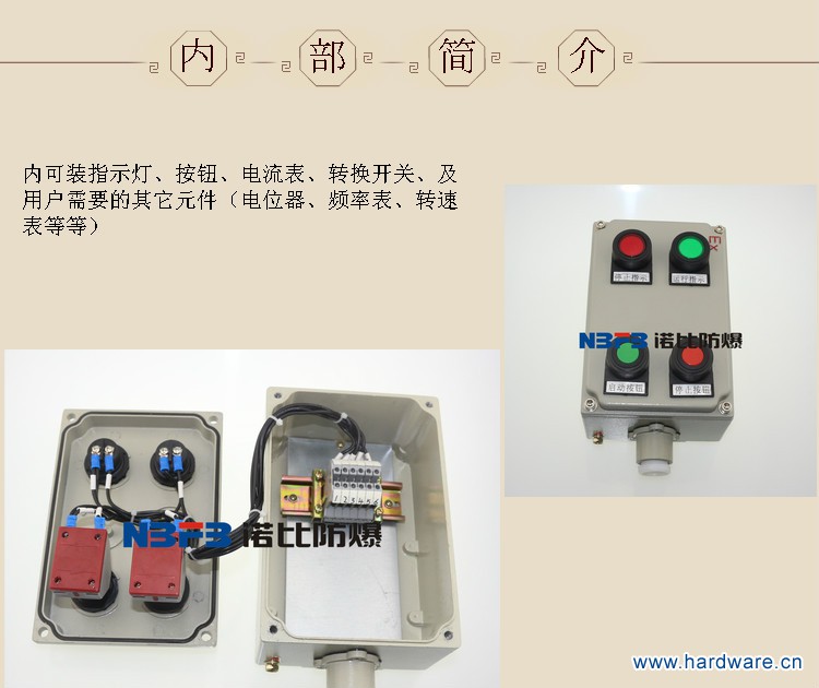 用途:本产品适用于含有爆炸性气体环境用的1区、2区危险场所,作为交流50Hz,电压至220/380V动力设备起动、停止控制使用。