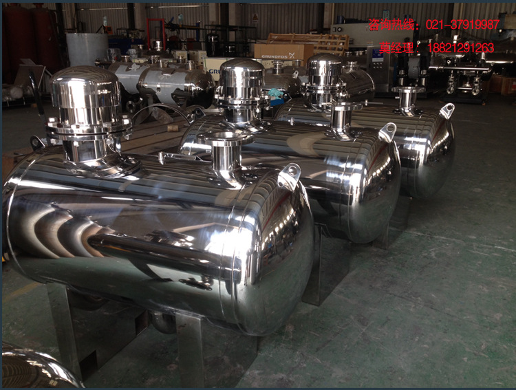 自来水不断进入罐体时,随着水位不断升高,罐体内的空气经真空补偿器自动排出。当水位上升到一定水位时,真空补偿器自动关闭,此时自来水仍不断进入,罐体内部压力逐渐增大,直至Z终罐内的压力等于自来水管网的压力。当用户用水增大或者自来水管网流量压力变小时,罐体内部水位会逐渐下降,当水位下降到一定值时真空补偿器自动打开,接通大气,罐体内无负压,水泵抽取罐体内的水。当用户用水量大、自来水管量小或者自来水停水时,罐体上的液位控制器控制水泵的停或开。