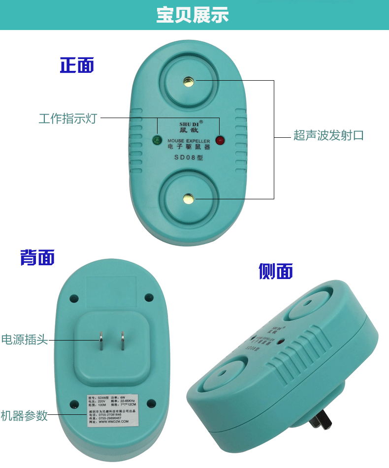 老鼠是通过超声波来交流的,本产品采用先进的微电脑变频技术,发射超声波刺激老鼠的神经系统和听觉系统,使其产生恐惧、烦躁不安,Z后无法在超声波的环境下生存而逃离。鼠敌SD08电子驱鼠器采用双波变频技术,不会使老鼠产生“适应性”和“免疫力”。