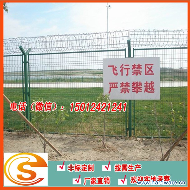 监狱防护网采用4.0-5.0mm高强度低碳钢丝焊接。监狱防护网网孔:50*100mm 50*200mm。网片加弯加丝加强筋,可大大增加围网的抗冲压力,为有效防止攀逃,采用直刺式刺网隔离带,是用柱体和普通刺绳横、纵、斜向交叉绑定成刺网隔离带。立柱一般为为60*60的方钢,产品均为热镀锌后采用高质量的聚酯粉末静电喷涂,采用国际流行的RAL颜色。监狱防护网又称作“Y型安全防御护网”,是由V型支架立柱,加强型焊接片网,立柱为Y型安全防盗连接件和热镀锌刀片刺笼组成加强度和安全防御性级别很高。近年来,被广泛应用在机场,军事基地等高安全场所。另外如果在机场护栏网顶部加装刀片刺丝,刀片刺绳后有很好的增强了安全防护性能。