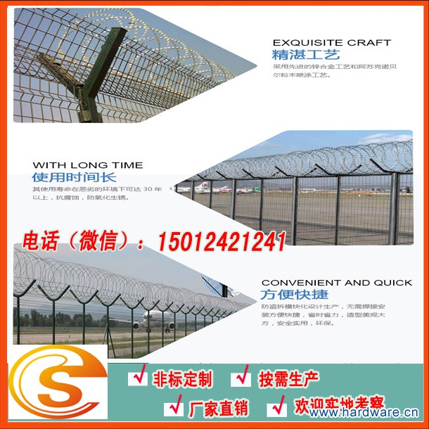 监狱护栏网又称作"Y型安全防御护网",是由V型支架立柱,加强型焊接片网,安全防盗连接件和热镀锌刀片刺笼组成强度和安全防御性级别很高。现被广泛应用在监狱,军事基地等高安全场所。注:如果在监狱护栏网顶部加装刀片刺丝、刀片刺绳后又很好的增强了安全防护性能。采用电镀、热镀、喷塑、浸塑等防腐形式,具有很好的抗老化、抗晒、耐候等特点。其产品造型美观、花色多样,既起到围栏作用,又起到美化作用。由于具有安全性高、防攀爬能力好,网片连接方式采用特制SBS紧扣件,有效防止人为的破坏性拆卸,横向四道折弯加强筋,使网面强度显著增加。