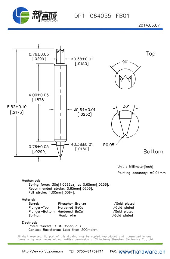 深圳新富城电子 0645.5-FB 双头测试探针 治具测试探针