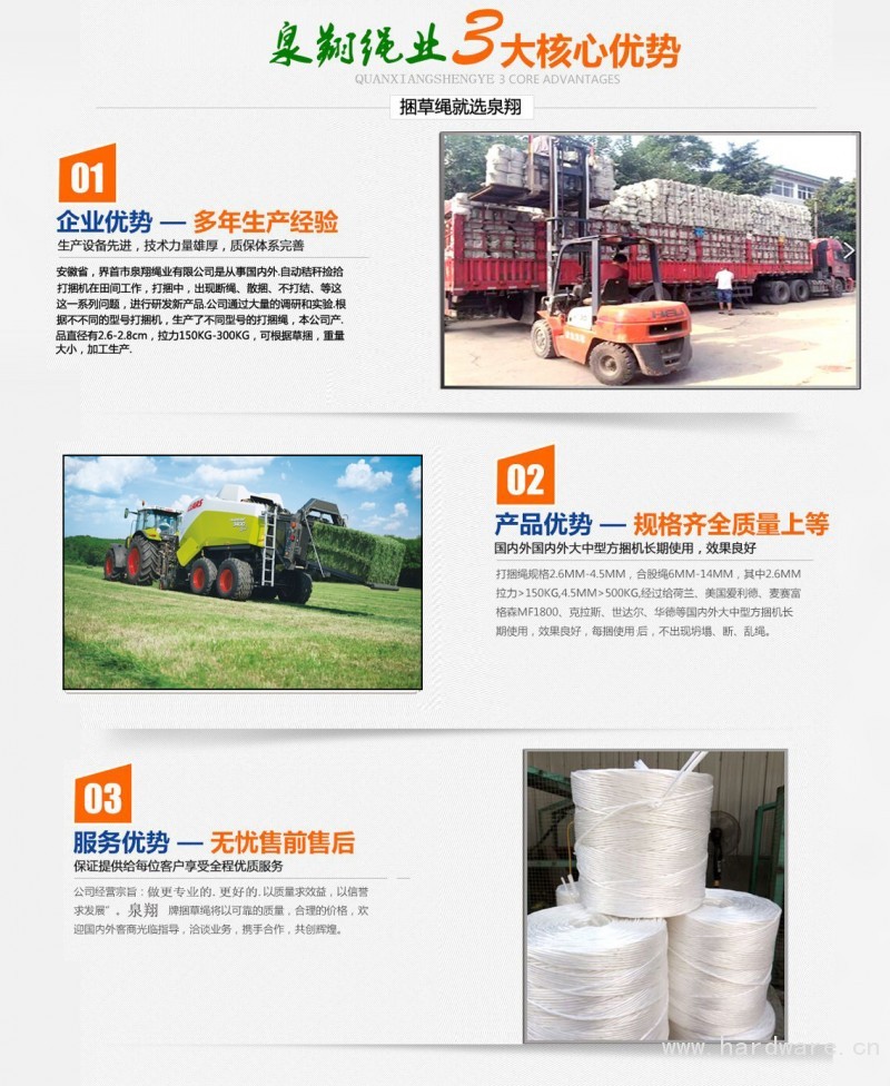 界首市泉翔绳业有限公司专业生产牧草小麦玉米秸秆打捆机专用捆草绳,捆草绳设备,打捆绳设备,捆草绳机器,打捆绳机器,黄金绳机器,打包绳机器设备,捆草网,捆草机网,圆捆网,圆捆机网,牧草网,捆扎绳 打包绳,麻绳等各种农业用绳,适用于华德 纽荷兰 克拉斯 牧邦 世达尔 海斯顿  玉龙等进口打捆机及捆机使用.欢迎订购。