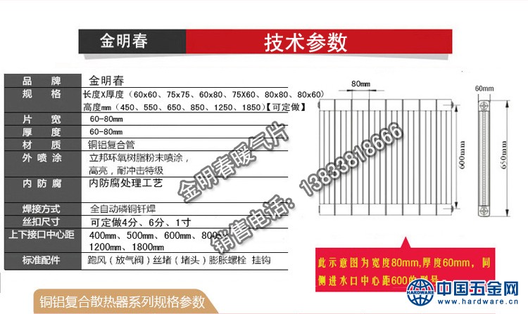 铜铝复合暖气片作为一种高品质暖气片产品,由于采用铜和铝为原材质,具有良好的热传导性能,材质的散热性能和节能效果起决定性作用。科学测定,对于金属材料热传导性能由大到小的顺序为:铜(401W/mK)、铝合金(237W/mK)、钢铁(80W/mK)、不锈钢(50W/mK)。铜铝复合暖气片热传导性只能按照铝合金计算,钢铝复合暖气片热传导性只能按照钢计算。