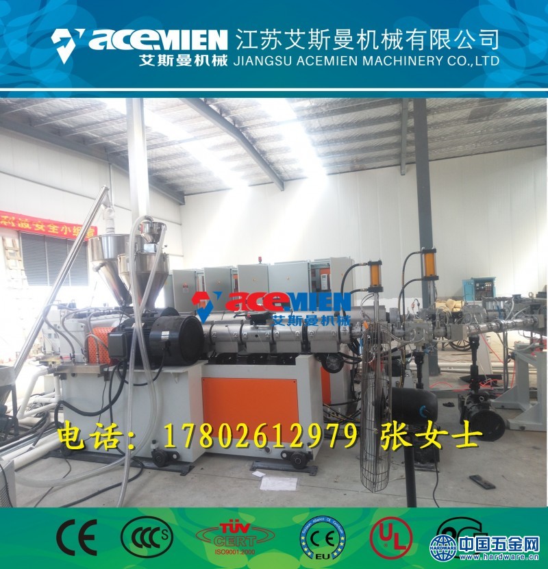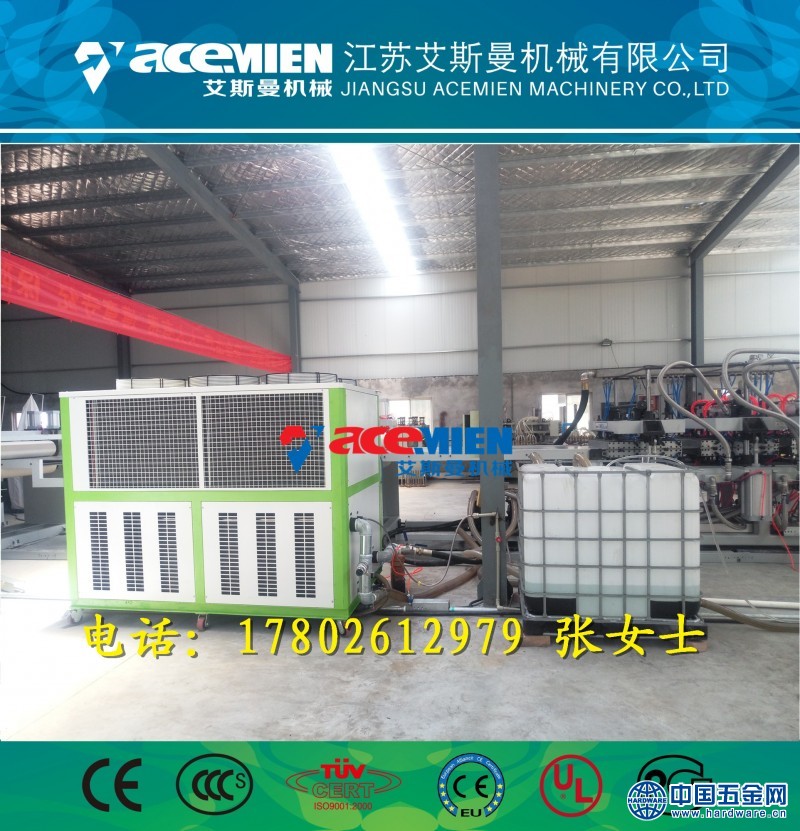 中空建筑模板生产线由单螺杆挤出机、液压换网器、模具、定型机、一次牵引机、退火炉、冷却箱,二次牵引机、横切机、输送机组成