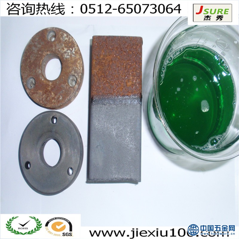 J SURE(杰秀)除锈防锈剂(液)是一种既除锈、防锈又可形成如同油漆一样的高分子附和结构的高性能产品。其一改以往除锈防锈的繁琐作业过程,在常温下只需简单的涂刷、喷淋或浸泡,即可同步完成“去锈防蚀”。由于独特的配方设计,本品具有很强的渗透能力,能迅速有效瓦解金属表面上常见的油污,并在将锈蚀分解的同时将其转化成一层具有防蚀性能的金属保护膜,从而达到优良的除锈及防锈效果。