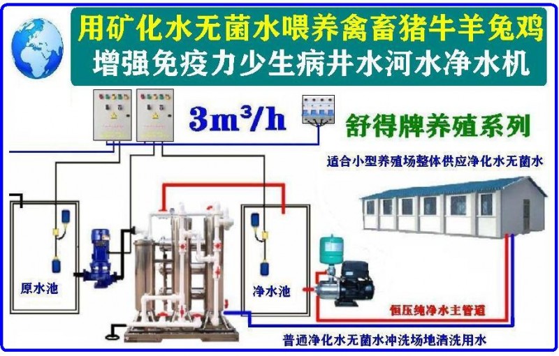 禽畜养殖行业什么也离不开水、可想而知水质量的重要性、哪怕就是禽畜喝水、洗澡、冲洗粪便、清洁养殖棚等使用的水都应该使用无菌水来完成、这样才能远离细菌、远离病菌就能稳定产值 --------