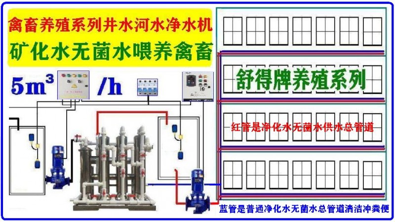 养鸡场安装每天足够用热水的太阳能,舒得净水设备是一进二出、二出水一(见图片上蓝色管道)蓝色管道是普通无菌半成品水不但用于冲洗场地、如果用的是河水冲澡时只能用于冷热水调节不进太阳能、用的是井水那就可以直接连接到太阳能加热和冷热水调节温度。二出水二(见图上标的红管道)红管道是纯净水直接给鸡子喝水。