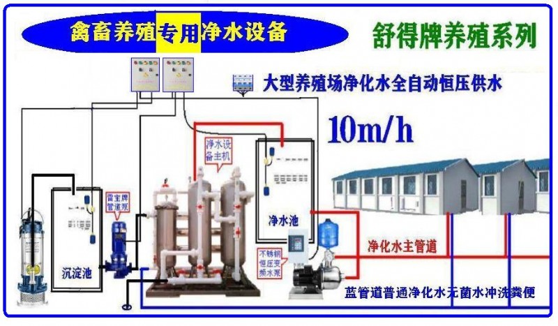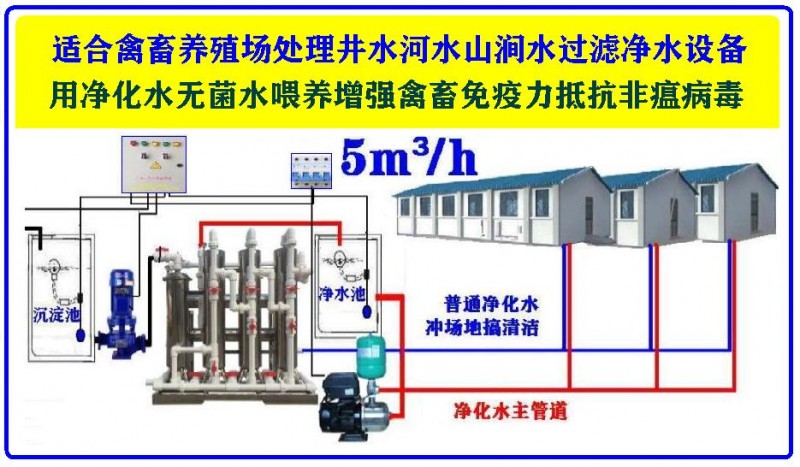 这样的源水如果考虑运用到养殖方面、建议不要在水库里直接抽水上来用,简单的办法就是在水库边山沟边不远处挖口井,水里粗的颜色杂质在通过土壤渗透时去掉一部,井水抽到养鸡场的原水池经过净水设备处理到成品水池(见安装示意图)、再通过恒压变频水泵送到总管道到兔场的每一处每一层的分管道就可以了,这样就不需要在每个鸡舍或每层楼鸡舍加个水箱、因为水箱的水容易产生二次三次或更多次污染甚至产生变异到病毒、这样的水对鸡子来说就会容易感染生病。