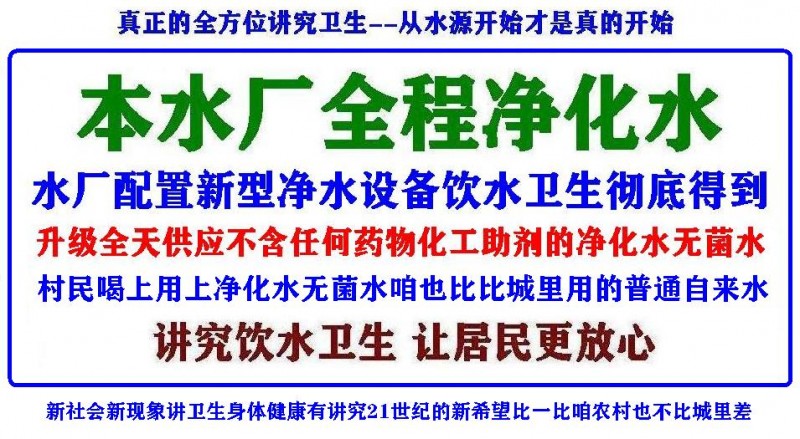 真正的讲究卫生---从水源开始才是真的开始、本水厂全天供应净化水无菌水、水厂配置新型净水设备饮水卫生得到升级全天供应不含任何药物化工助剂的净化水无菌水 解决饮水卫生--让居民更放心、村民喝上用上净化水无菌水咱也比比城里用的普通自来水、新社会新现象讲卫生身体健康有讲究21世纪的新希望比一比咱农村也不比城里差,欢迎选择舒得净水新二代欢迎试用、选择舒得净水--让您有想象不到的效果、舒得产品价格不高您用得起一次投入用20年不是问题、所有规格型号质保60个月。