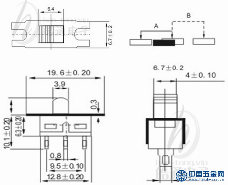 两档双极两位6脚塑胶滑动开关H25-0322PC