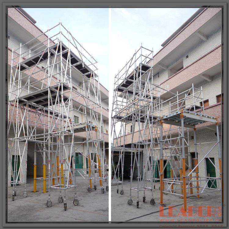 3.铝制脚手架在室内、室外均可使用、无噪音、更环保、不损伤地面、无工作死点,任何工作地形、地面都可搭设。