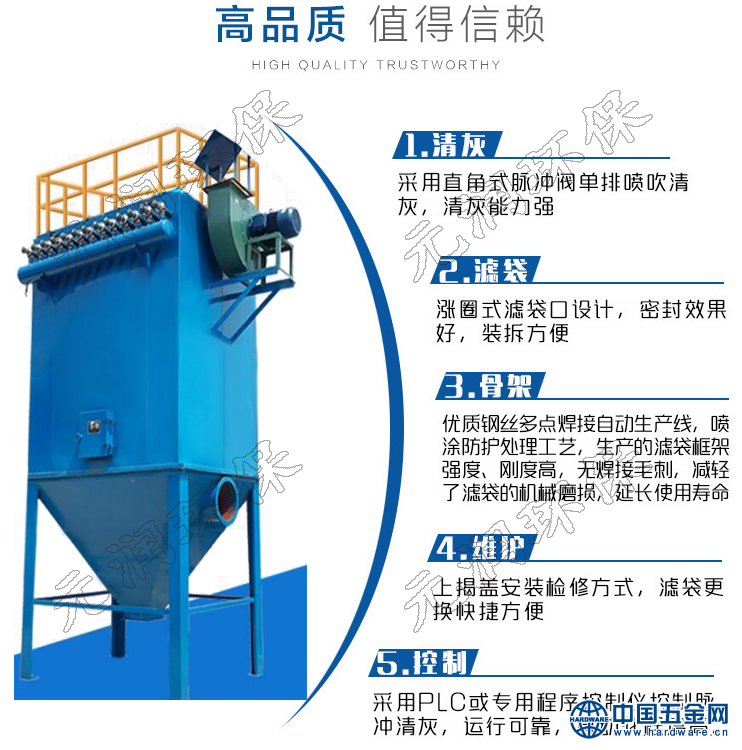 过滤式除尘装置包括袋式除尘器和颗粒层除尘器,前者通常利用有机纤维或无机纤维织物做成的滤袋作过滤层,而后者的过滤层多采用不同粒径的颗粒,如石英砂、河砂、陶粒、矿渣等组成。伴着粉末重复的附着于滤袋外表面,粉末层不断的增厚,布袋除尘器阻力值也随之增大;脉冲阀膜片发出指令,左右淹没时脉冲阀开启,高压气包内的压缩空气通了,如果没有灰尘了或是小到一定的程度了,机械清灰工作会停止工作。