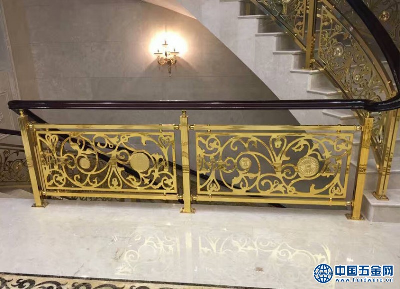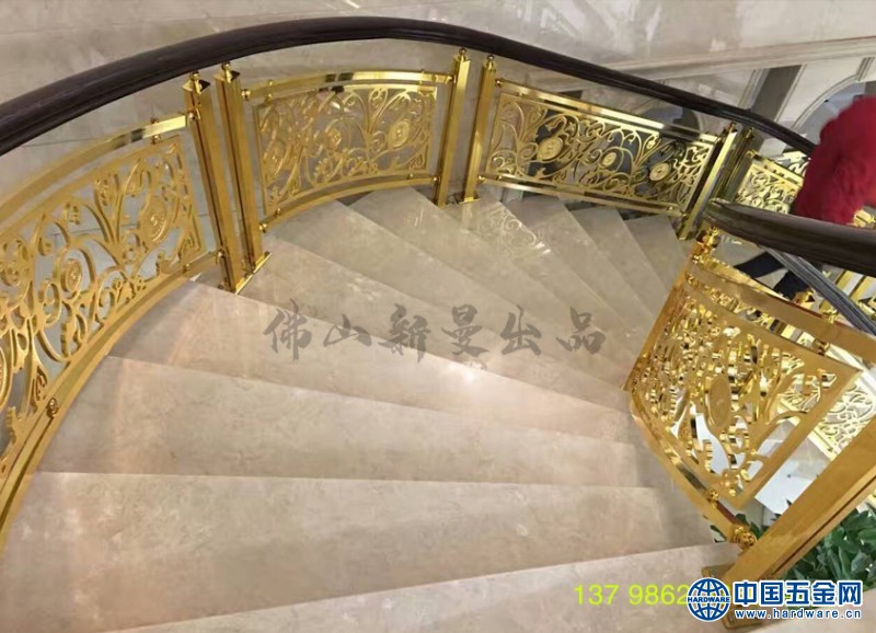 新曼五金制品厂专业 生产欧式铝板雕花楼梯护栏,弧形铝板雕刻护栏,水镀钛金铝板图案浮雕护栏,以它独特的风格,亮丽的光泽,精美的造型,舒适细腻的手感,高贵优雅的品位而被广大用户所认可,为新世纪城市建筑,酒店,宾馆,豪华别墅,娱乐场所装饰,时尚住宅的装饰装修整添了一道靓丽的风景。