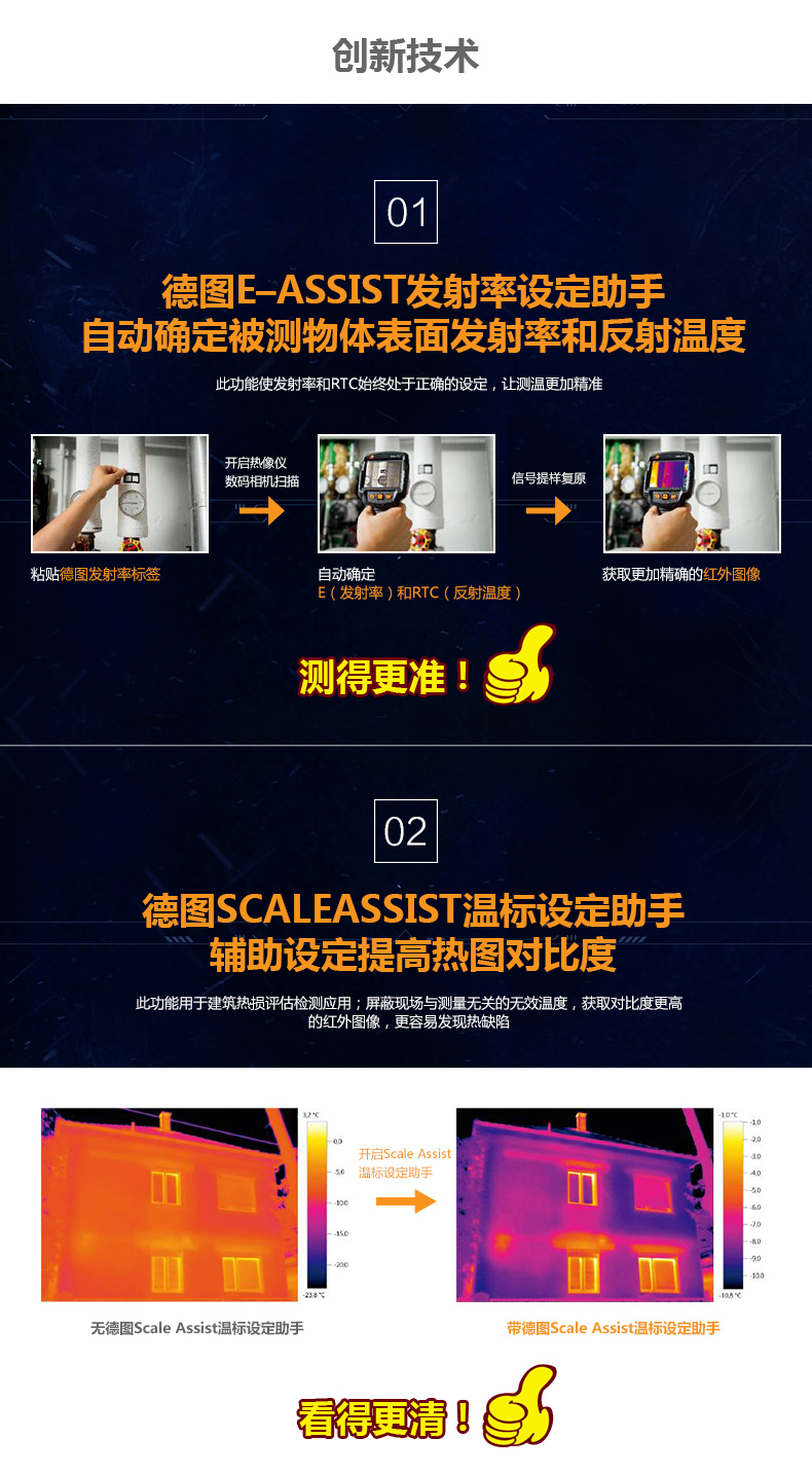 testo 868热像仪可以让工作更加快速方便——专业的热成像质量。您可以使用其便捷的功能生成无差错和客观可比的红外图像。借助IFOV警示器,?-Assist(发射率辅助)以及ScaleAssist(温标辅助)功能,不仅可以帮助您避免测量误差,并且还可以针对建筑热成像合理的设置发射率(?)和反射温度(RTC),以及对对比度进行合理设置。