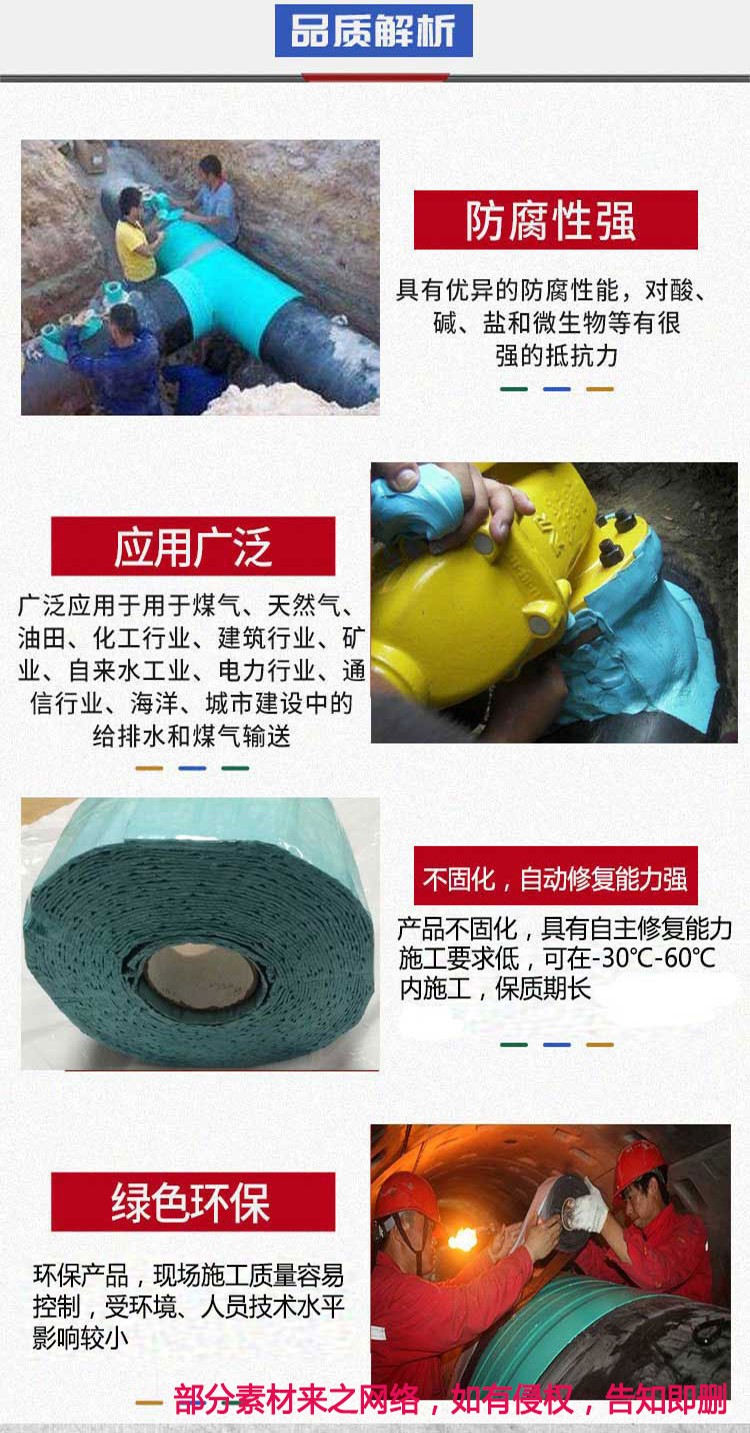 产品在使用时,无需涂刷底漆,无脱落,无开裂。具有较强的粘结力,良好的耐化学腐蚀性,抗阴极剥离性能,可彻底杜绝水汽渗透和化学介质的腐蚀。