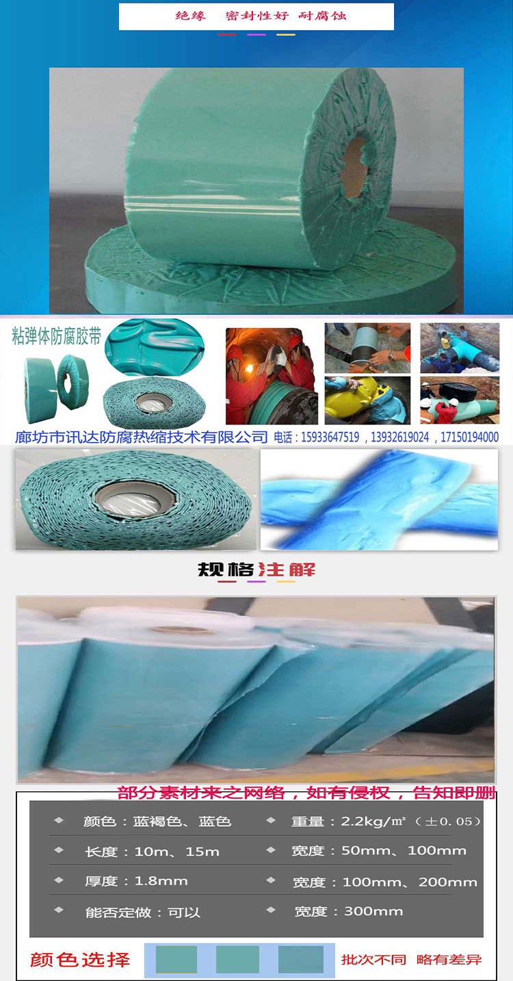 本产品采用新型胶粘专用材料生产,是一种永不固化的聚合物,除了常规的粘性以外,还具有独特的冷流特性。在防腐和修复的过程中可以实现自修复功能,以达到Zjia密封防腐的效果。粘弹体胶带配套防腐膏体,膏体用于堵漏,胶带用于缠绕防腐,也可以配合膏体和胶带同时使用。