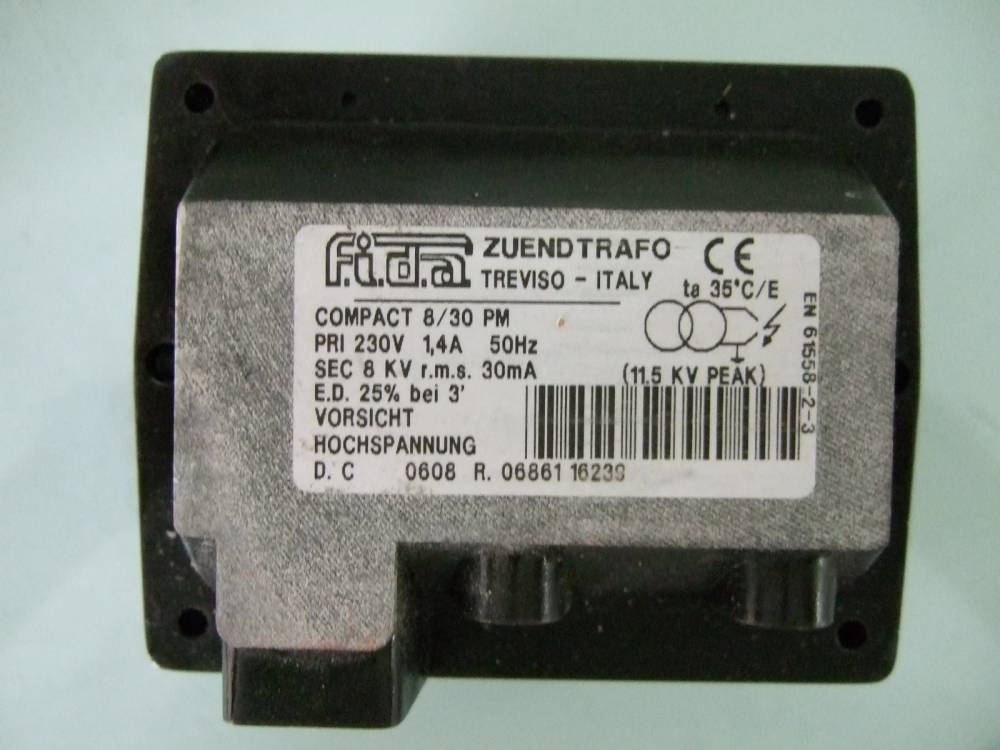 Ignityon transformer F.i.d.a. zuendtrafo Treviso - ItalyCompact 8/20 CMPri 230V 1A 50HzSec. 2 x 4KV r.m.s. 20mA (11,5 KV Peak)E.D. 25% bei 3minVorsicht hochspannung; ta 35 C/E; EN 61558-2-3; D.C 1109 P. 08894 53086
