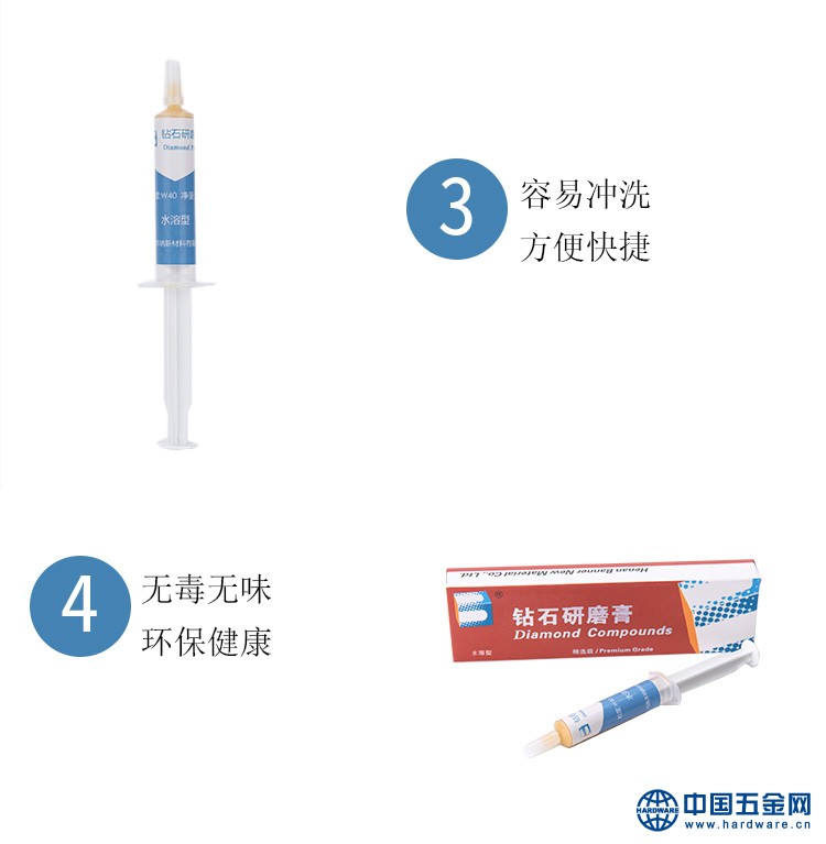 金刚石研磨膏采用高强度金刚石颗粒为原料,粒度均匀,保证磨削均衡,自锐性能优异,清水即可清洗。金刚石含量更高达10%,磨削速度更快,提高您的工作效率,使加工的产品光洁度更好。