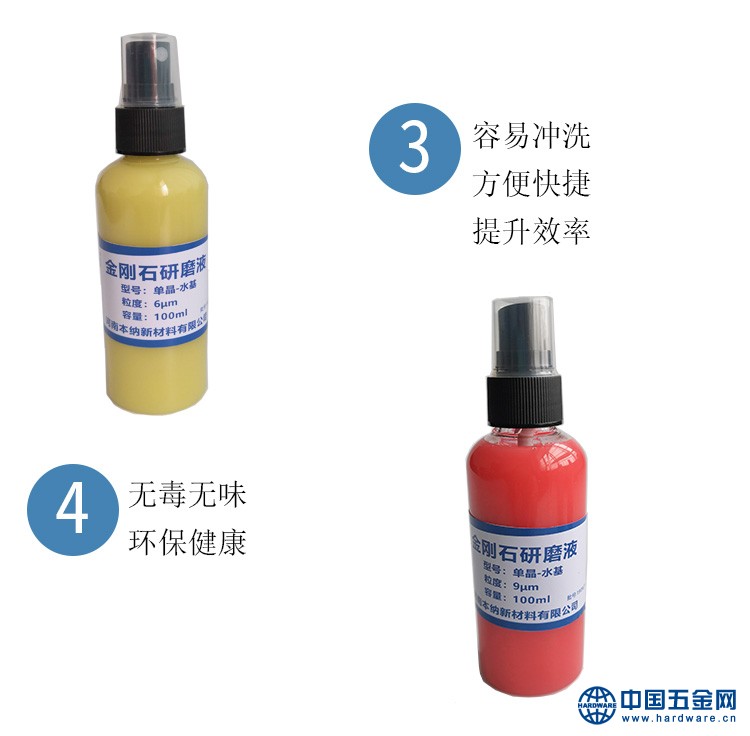 选用优质金刚石微粉做磨料,选取优质的辅材保持磨削效率的Z大协同效应,配以独特的研磨介质,融物理作用和化学作用于一体,使金刚石微粉处于悬浮状态。抛光介质使用充分,研磨效果好,不易产生划痕,硬度较高,刃口尖锐锋利,对软硬材料都有良好的研磨作用。