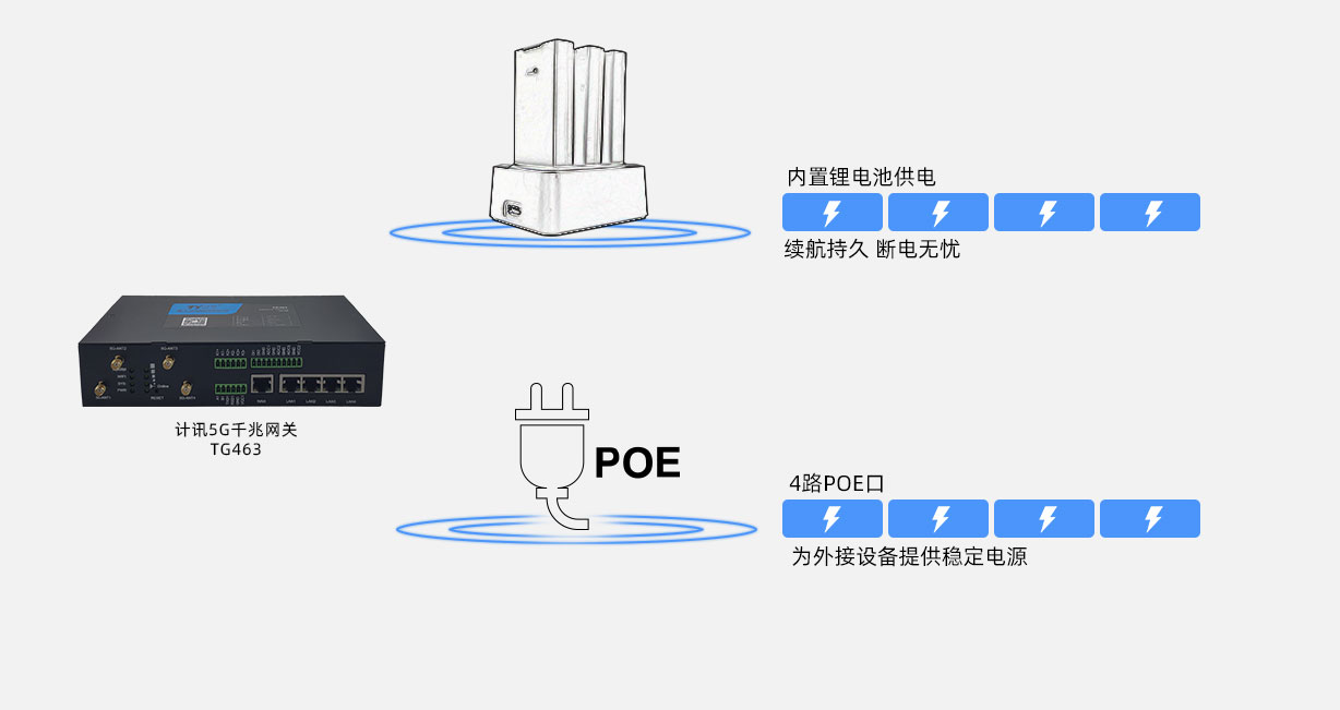 支持内置锂电池供电,支持4路POE口,可为外接设备提供稳定电源。独特的内置电池设计,及外设供电能力,