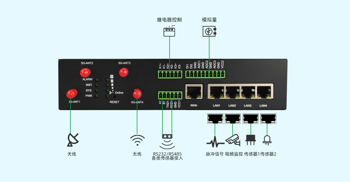 丰富的采集控制端口满足各种传感器的采集和控制,支持工业路由器功能,实现4路局域网接入和视频数据的采集和上传。