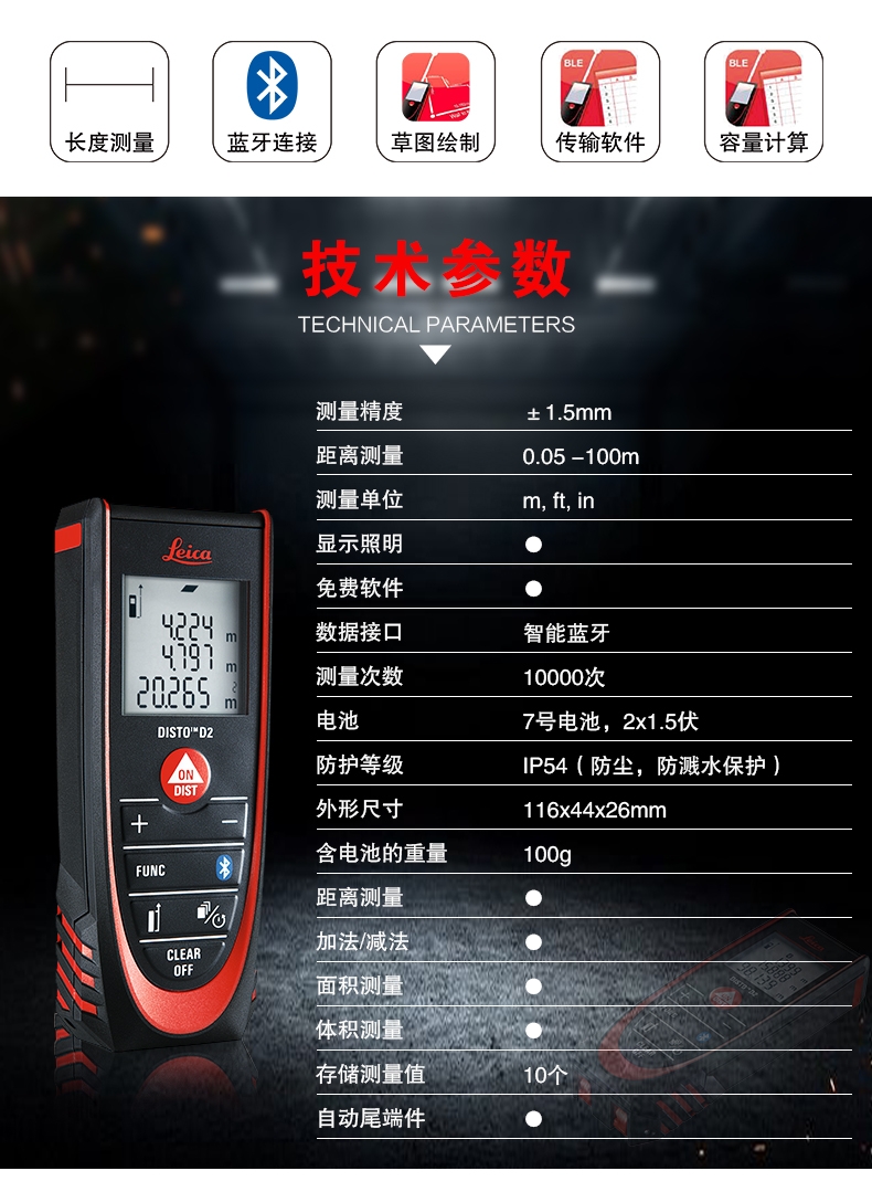 徕卡Disto D2 手持激光测距仪 :小巧的伙伴 – 适于室内应用,该机型机身小巧、便于携带,Z远测程可达100米,内置了非常丰富实用的测量功能:Z小值/值、面积/体积测量、连续面积测量、间接测量、点放样是室内测距应用设计类别中极好的测距仪。