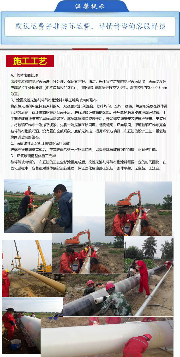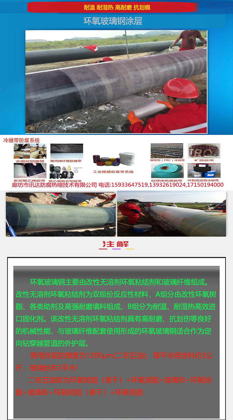 环氧玻璃钢主要由改性无溶剂环氧粘结剂和玻璃纤维组成。改性无溶剂环氧粘结剂为双组份反应性材料,A组分由改性环氧树脂、各类助剂及高强耐磨填料组成,B组分为耐温、耐湿热高效进口固化剂。该改性无溶剂环氧粘结剂具有高耐磨、抗划伤等良好的机械性能,与玻璃纤维配套使用形成的环氧玻璃钢适合作为定向钻穿越管道的外护层。产品执行标准SY/T7368-2017。
