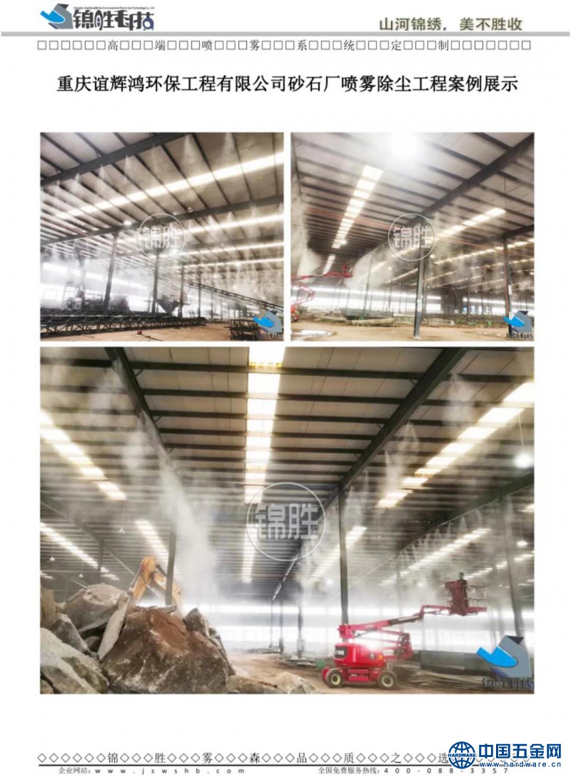 湖南长沙人造雾厂房 砂石厂 降尘、降温 锦胜雾森 利用降水井或消防水池上中的水通过“高空喷雾降尘系统”形成飘飞的飞雾,吸附空中的灰尘颗粒和杂质,在现场风速低于二级风情况下,可使施工现场大气中颗粒物浓度减少84%,同时在高空喷雾一段时间后,地面将形成一片湿润状态,有效抑制灰尘的再次扬起。
